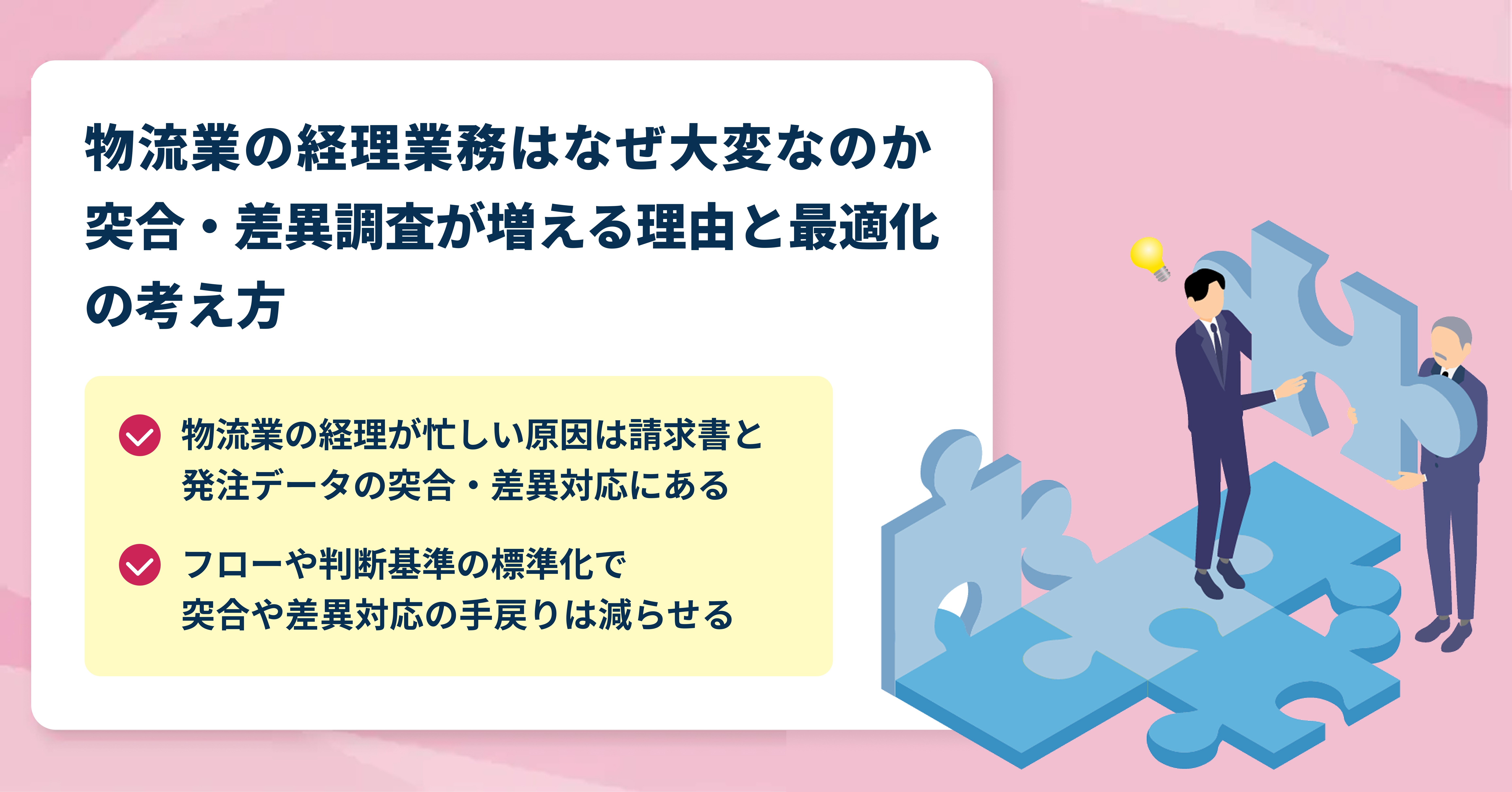 物流業の経理現場では、請求書と発注データの突合や例外対応が避けて通れません。これらは一見、単なるチェック作業に見えますが、実際には各取引先ごとのフォーマット違いや附帯費用の発生タイミングによるズレ、現場ごとの運用差など、複雑な要素が絡み合い、標準化を難しくしています。