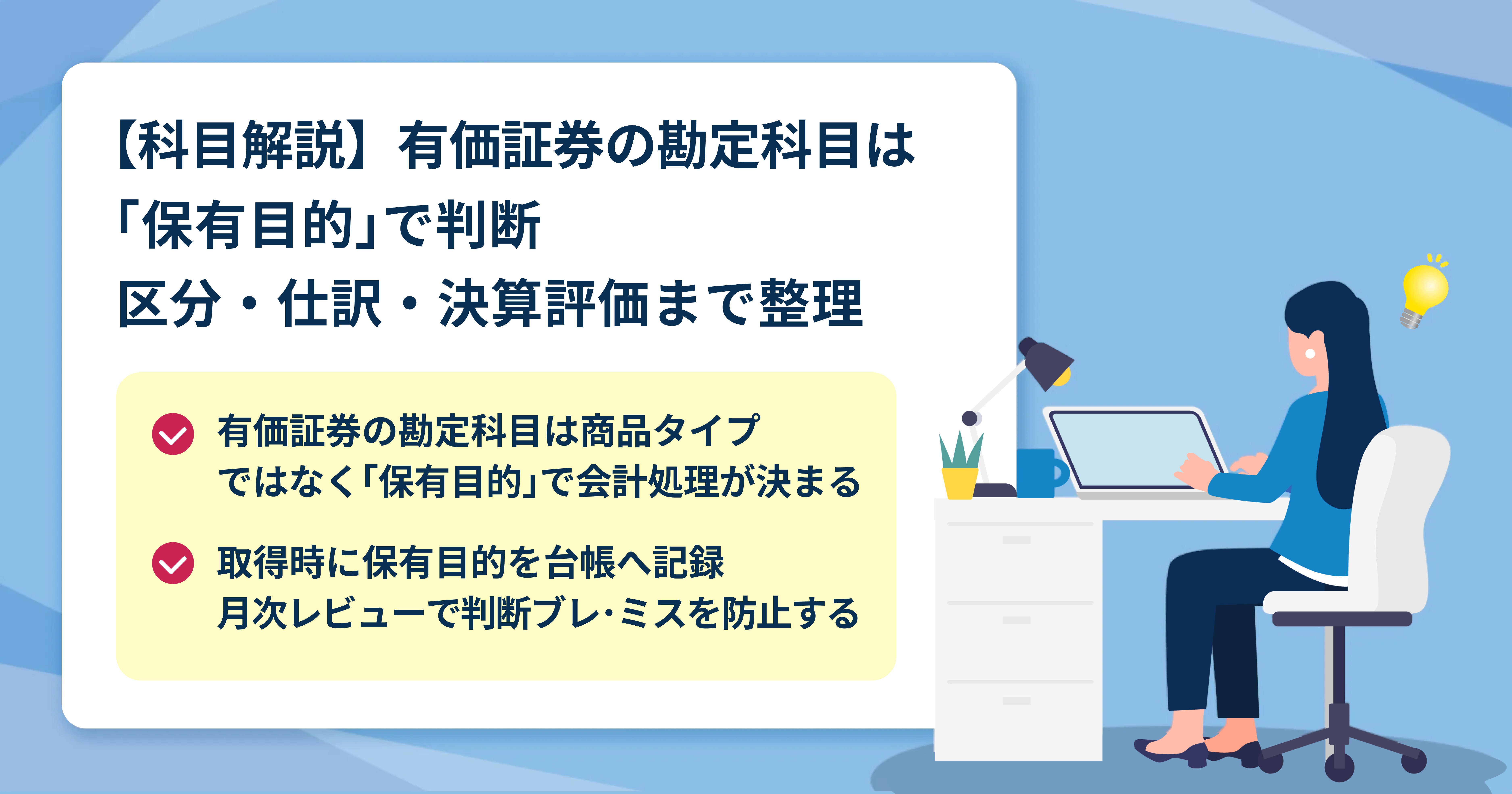 本記事では、こうした悩みを解消すべく、有価証券の勘定科目を「保有目的」で判断する会計基準の考え方を軸に、仕訳例、決算時に確認したい評価・表示・減損処理、実務で起こりがちなミスと防止法などを体系的に解説します。