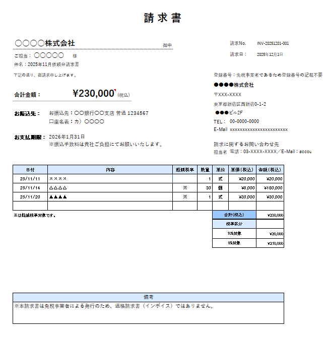 請求書(免税事業者の方向け)Excelテンプレート